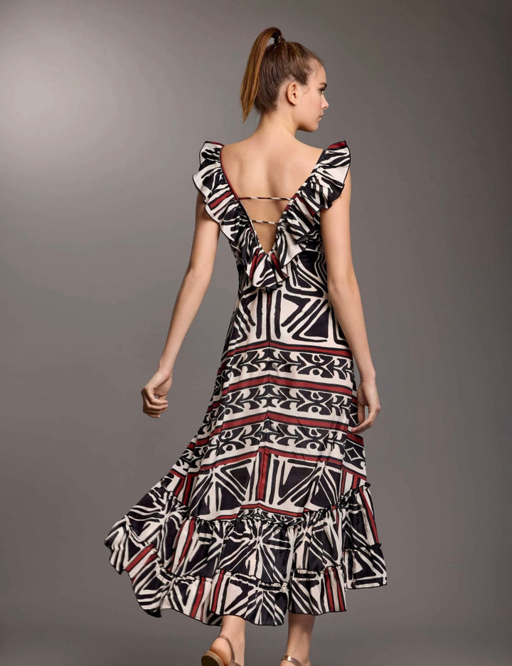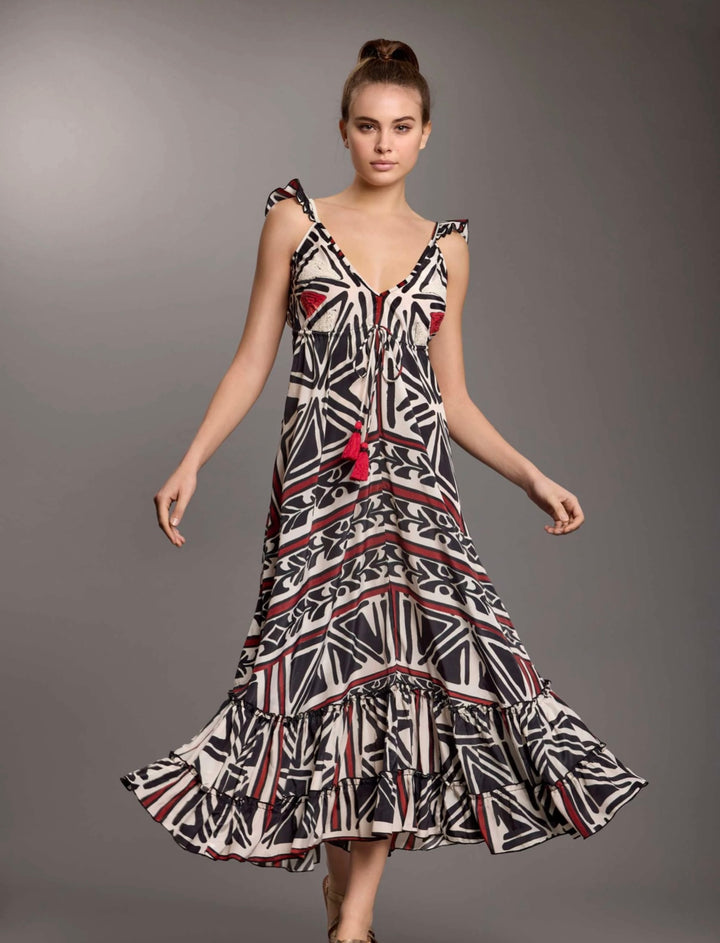 L'abito Creta con stampa etnica è l'ideale per un look sofisticato e allo stesso tempo rilassato. Il tessuto leggero e fluido si adatta delicatamente al corpo, mentre le spalline con volant e lo scollo a V profondo aggiungono un tocco di eleganza. La coulisse in vita, con laccetti impreziositi da nappine, definisce la figura in modo femminile e raffinato.