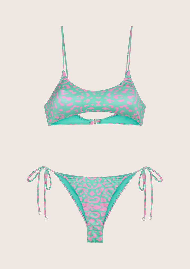 Bikini F**K top e slip regolabile in tessuto lycra maculata, dotato di imbottitura interna estraibile e chiusura con gancio
