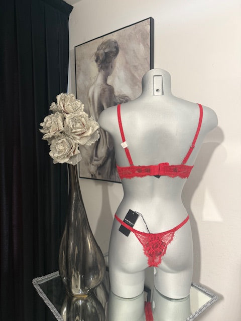 Coordinato in pizzo rosso con reggiseno push-up e perizoma.