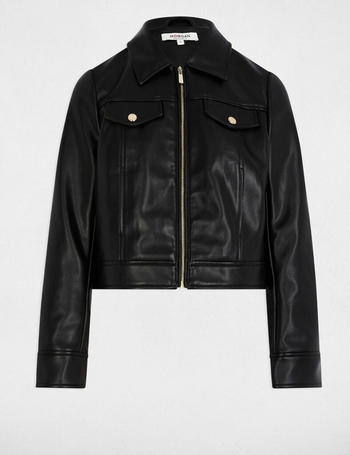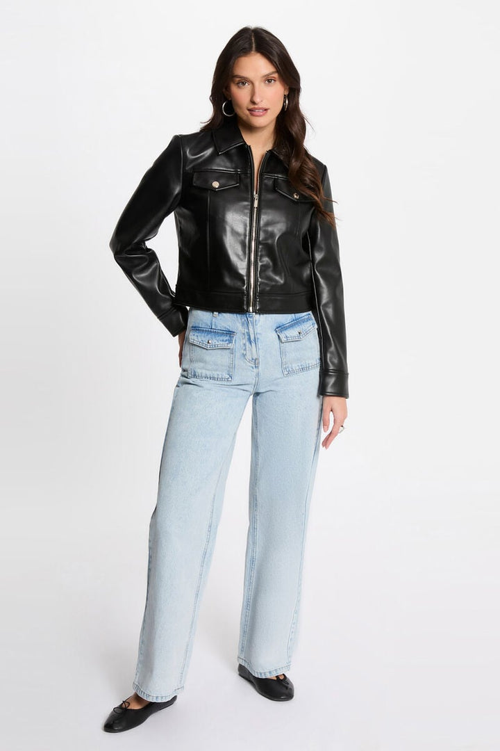 Giacca corta in ecopelle dal taglio avvitato, pensata per valorizzare la silhouette. Caratterizzata da colletto con revers, maniche lunghe e chiusura frontale con zip. Il carrè sul petto è arricchito da una patta decorativa con bottone a effetto tasca, per un dettaglio sofisticato e grintoso.