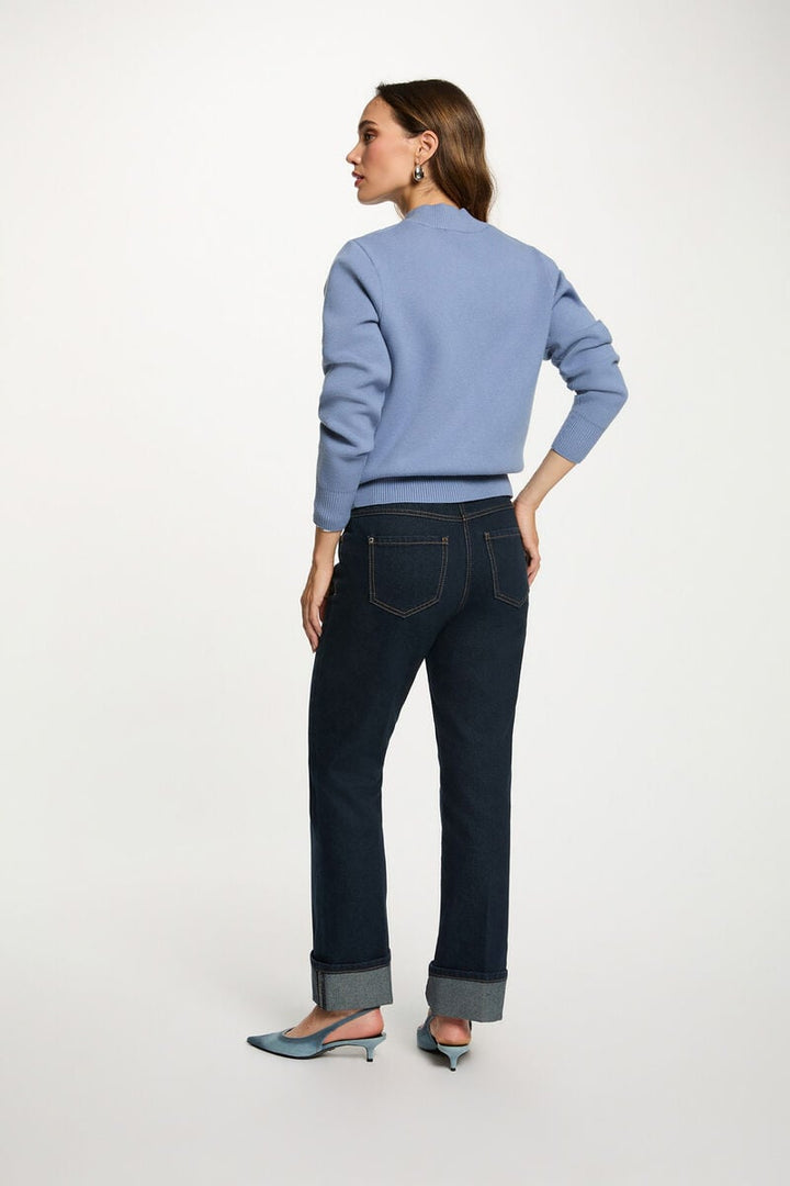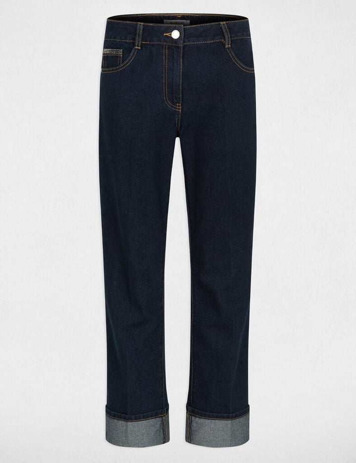 Realizzati in denim scuro, questi jeans a gamba dritta offrono una vestibilità comoda e senza tempo. Il design a 5 tasche, con cuciture a contrasto, dona un tocco classico e raffinato. Il risvolto alto sul fondo gamba aggiunge un dettaglio casual-chic, perfetto per un look moderno e curato.