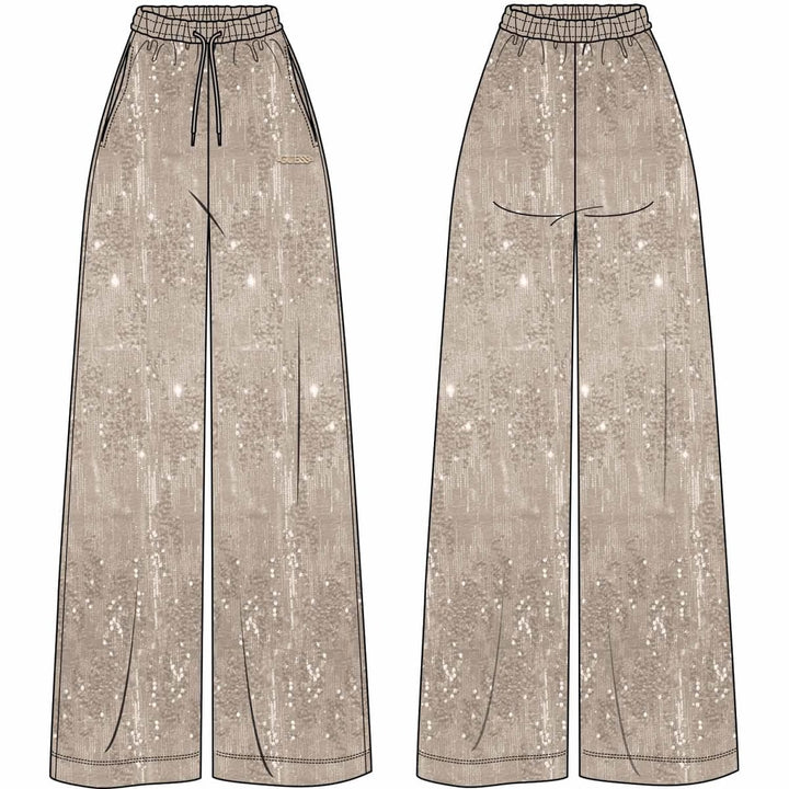 Realizzati in morbido velluto color cipria, sono impreziositi da una cascata di paillettes tono su tono che regalano luminosità e movimento ad ogni passo. Il design presenta: vita elasticizzata con coulisse...