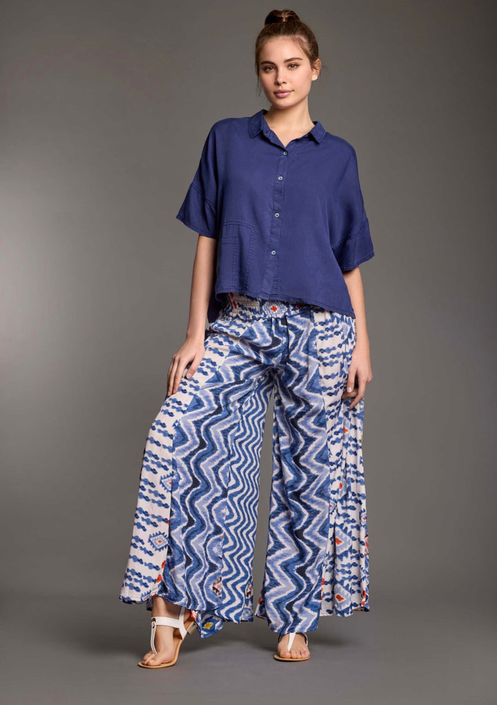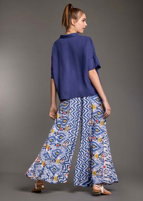 I pantaloni Clara con stampa etnica sono ideali per un look fresco ed elegante. La gamba larga e il taglio fluido garantiscono comfort nelle giornate più calde, mentre la vita elasticizzata assicura una vestibilità ottimale. La fantasia etnica aggiunge un tocco distintivo, rendendo questi pantaloni versatici e unici.