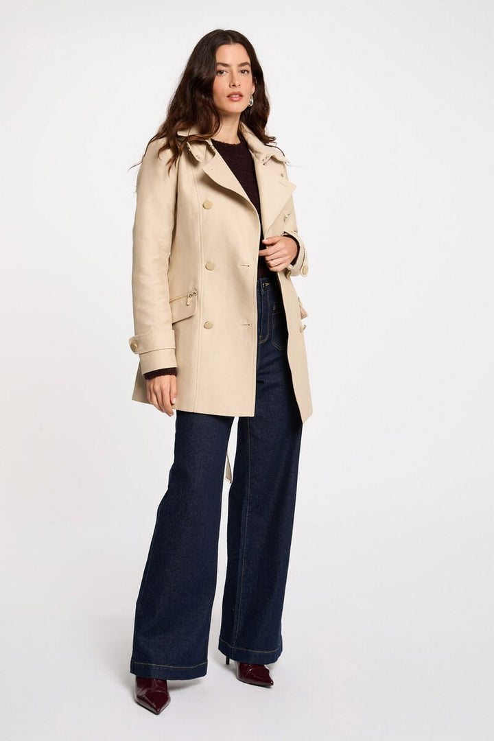 Trench con cappuccio e cintura in vita da annodare. Modello a vita media con revers a lancia, chiusura doppiopetto e polsini con bottone. Dotato di due tasche anteriori con patta e due tasche con zip, unisce praticità e stile senza rinunciare all'eleganza.